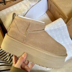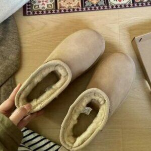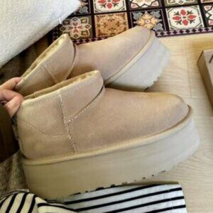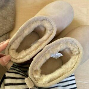 Warm and stylish UGG boots. Tan suede with cozy shearling lining. Ideal for winter wear.