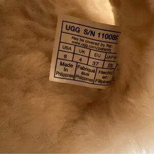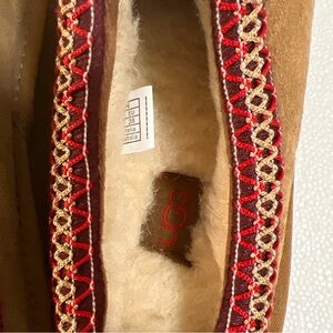 Cozy UGG slippers in tan with red trim. Perfect for comfort and style.