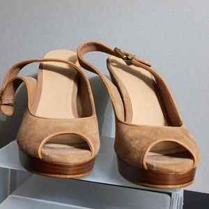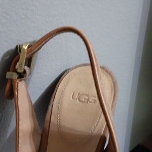 UGG Johana Tan Suede Slingback peephole 3/4 Platform & 4 inch Heels with soft suede and leather piping trim with adjustable brass tone buckle. comfortable and luxurious. preowned in very good condition smoke free home