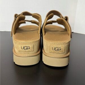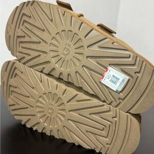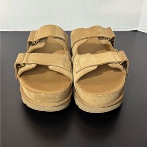 Stylish UGG sandals with a comfortable platform. Features a tan suede finish and durable sole.