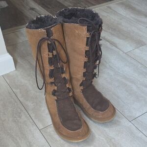 These UGG winter boots are crafted from tan and brown suede, featuring a tall shaft and a lace-up front for a secure fit. The moccasin-style toe and flat sole ensure comfort and durability, making them perfect for cold weather conditions.
