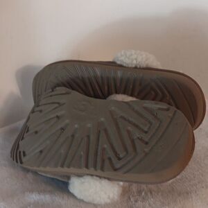 Comfortable UGG slippers with soft shearling lining. Size 6. Tan suede exterior and plush cream accents.