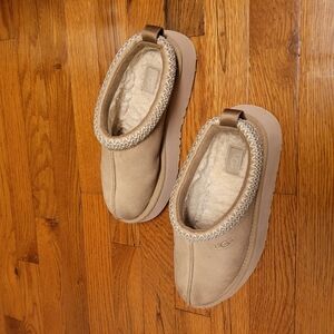 Experience the ultimate comfort with UGG's tan mules, crafted from soft suede for a cozy feel. These slip-on shoes feature a relaxed fit and a simple, unadorned design, making them perfect for effortless wear. Ideal for casual outings or lounging at home, they offer a versatile and stylish addition to your footwear collection.