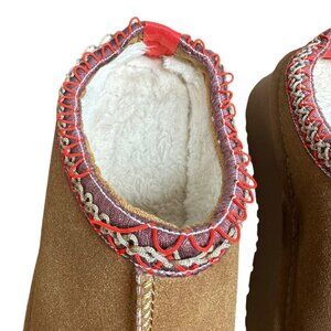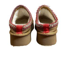 Step into cozy luxury with these authentic UGG Tazz platform slippers in the classic Chestnut color. Crafted from soft suede with UGG’s signature sheepskin and UGGplush™ wool lining, these slippers deliver all-day comfort and warmth. The embroidered braid detail and red heel loop add a fun, modern twist, while the elevated platform sole gives them a bold, stylish edge. Perfect for indoor lounging or casual wear outdoors.