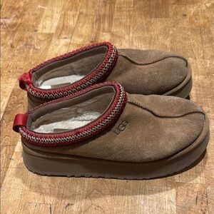 Stylish UGG slip-ons in tan suede. Features red accents for a pop of color. Ideal for everyday comfort.