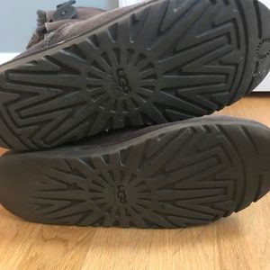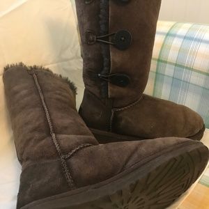 Very nice condition UGG tall Triplet Bailey Button boots. Very little wear on sole. No toe scuffs. Fleece inside is in great shape. Small dark smudge on the top front of the boot. Color is chocolate brown.