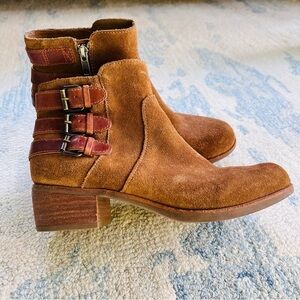 Water-resistant leather and richly oiled water-resistant suede ankle boot; Fixed leather rear straps with antiqued metal buckles;