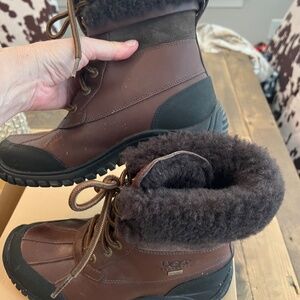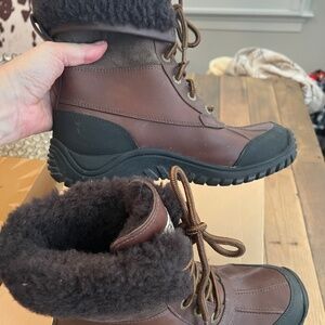 Brownish and black weather boots in size 9. Ugg Australia. Retailed for $200 from Nordstrom. Comes with box. Upper is leather and genuine sheepskin. Lining is synthetic and genuine sheepskin. Bottom is rubber.