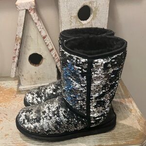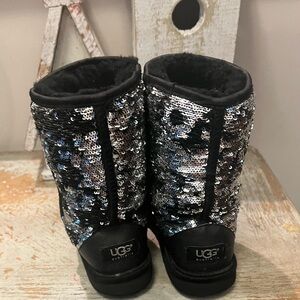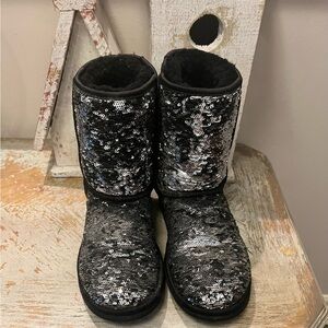 Stylish UGG winter boots. Black and silver sequins. Cozy and warm. Used good condition. Vintage. Rare.