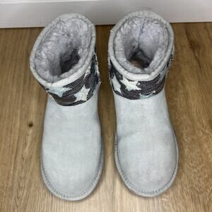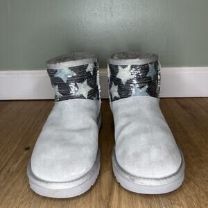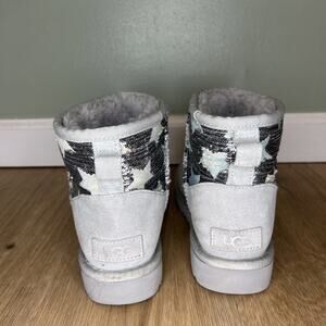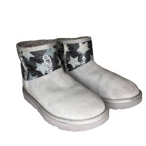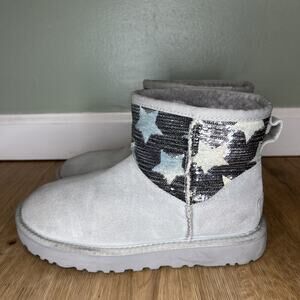 UGG WOMENS 6 BOOTS CLASSIC MINI II SEQUIN STARS GREY SPARKLY SHEARLING COMFORT PREPPY