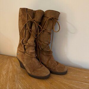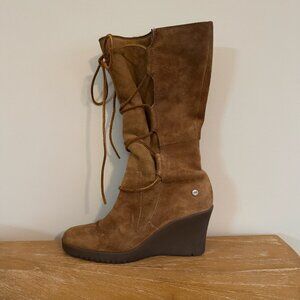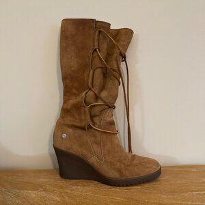 UGG Wedge Heel Boots Tan Suede Lace-Up Cozy Fall Winter Fur Boot 9 Elsey Brown