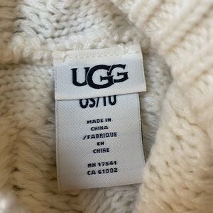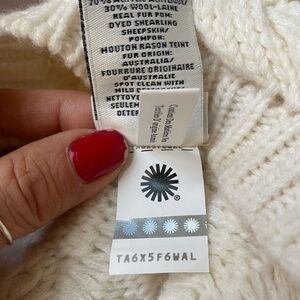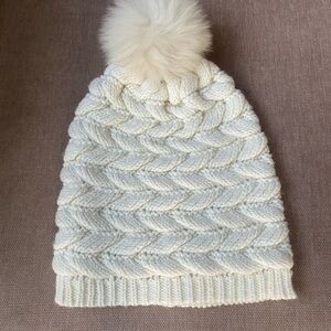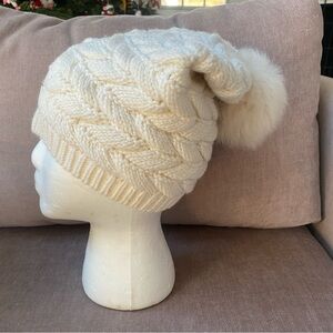 UGG white knit beanie hat with faux fur pom-pom. In excellent preowned condition with no signs of wear. One-size-fits-all