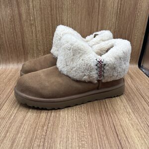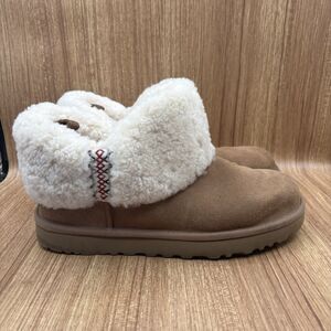 UGG Women Classic Ultra Mini Braid Sheepskin Collar Booties Size 11 Chestnut