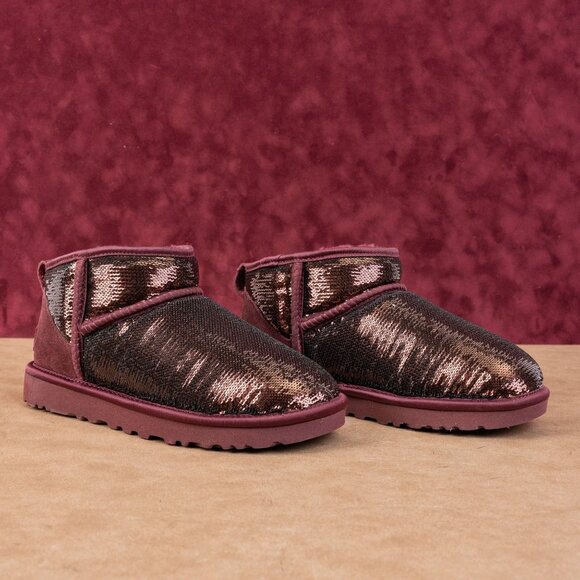 The UGG Ultra Mini Mirror Ball boot shines in a burgundy sequin/glitter upper. Retaining the plush warmth of UGGplush lining and the easy, low-cut shaft, this boot is a show-stopping update to the iconic Mini.