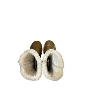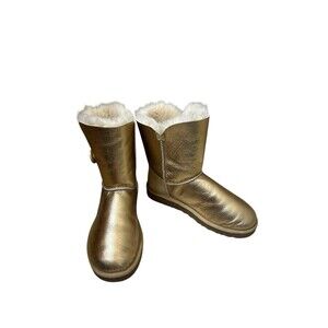 UGG Women's 7 Bailey Button Shearling Lined Boots 1002951 Gold Metallic Mirage. Great overall condition, inside shearling still nice and soft, un matted. The outer leather is in very nice shape too, a light scratch one one of the boots to the gold (see closeup) but it is on the inside of the boot. Toe areas are in great shape. Stored in a smoke-free environment.