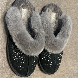 Cozy black slippers with plush gray fur lining. Embellished for added style.