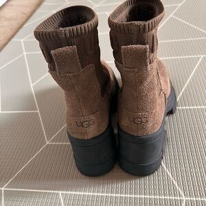 Stylish UGG ankle booties in rich brown. Features a chunky black sole. Perfect blend of comfort and fashion. Only worn a few times.