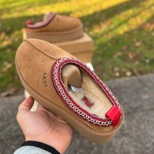 Stylish UGG platform shoes in brown with red accents. Cozy and fashionable for any casual outing.