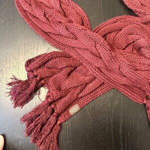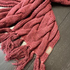 Indulge in the luxurious warmth of this UGG scarf, crafted from rich burgundy yarn. Elevate your style with its intricate cable-knit pattern and playful tassels. This accessory promises both comfort and elegance, making it an irresistible addition to your cold-weather wardrobe. Wrap yourself in sophistication and stay cozy all season long.
