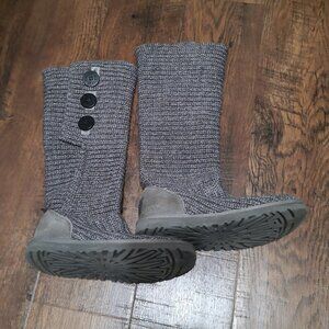 UGG Women's Classic Cardy Sock Boots Gray Knit Sheepskin Winter Fold Over Button Bootie Size 6