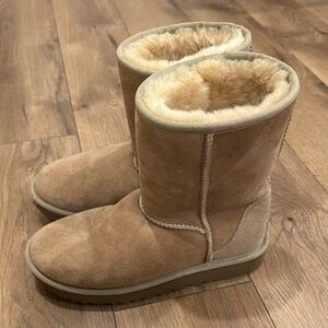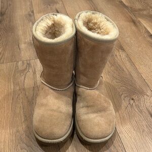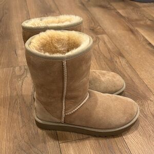 UGG Women’s Classic Short II Sand Tan Suede Winter Boots Sheepskin Lining Size 7