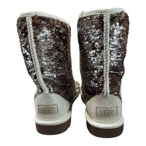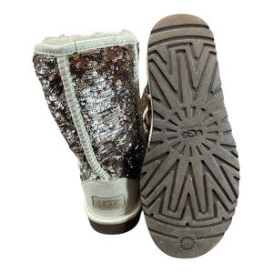 Eye-catching UGG boots with sparkling sequins. Features cream and brown tones. Sequin upper. UGGpure wool lining. UGGpure wool insole. Treadlite by UGG outsole. Satin binding. 8" shaft height. Round toe. Add a touch of shimmer to your step with these cute and comfy sequin boots from UGG. They feature everything you love about the classic UGG boot - a plush wool lining and a light, flexible sole - plus a super stylish sequin upper that is sure to turn heads. Wear with skinny jeans, leggings, skirts or dresses for casual comfort you're sure to love!