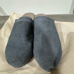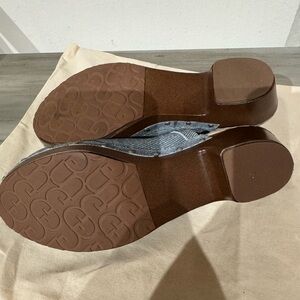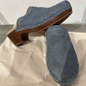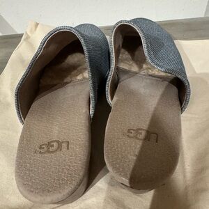 Stylish UGG mules in denim blue. Comfortable and chic for everyday wear.