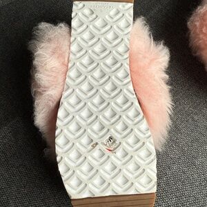 Sheepskin fluffy sandals in a pale pink. Post toe sandal under luxurious real sheepskin in a pale shell pink. I call these my Barbie sandals.