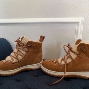 Bought December 2022, barely worn. No discolouration or scuff marks on waterproof suede, faux fur on the top of the tongue, or the rubber sole. Good to wear in any and all weather conditions. You can lace them up all the way (in pic left shoe), or you can leave the metal shoelace eyelet empty (in pic right shoe). They are very comfortable and suitable for just about anything.