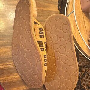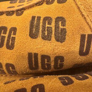 A pair of women's UGG slippers featuring the UGG logo all over.