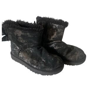 UGG Women's Mini Bailey Bow Black Suede Glimmer Faux Fur Lined Boot • Size 8