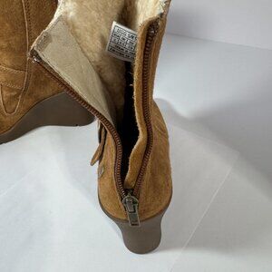 Great ankle boots with back zipper and side buckle detain in great shape. Color is sumptuous rich tan suede wedge creates stability and traction bottom, is in great shape. Size 8
