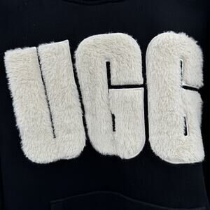 UGG Women's Rey Fuzzy Hoodie Sz L Black Spell Out Logo Fleece Lined Soft Lounge