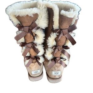 UGG Womens Size 10 Boots Bailey Knit Bow Tall Chestnut Brown Suede Shearl…