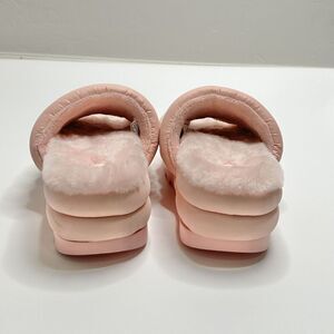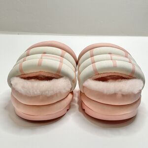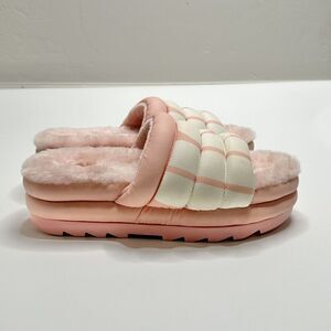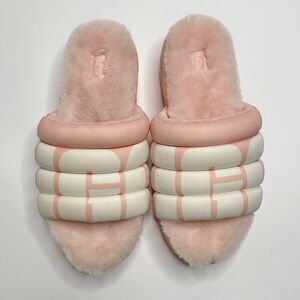 UGG Women's Size 12 Maxi Slide Logo Sandal Pink Scallop Puff Platform Fur Lined