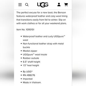 These UGG boots are perfect for the winter season and outdoor activities. With a low block heel and standard shoe width, these boots are both functional and fashionable. The UGG Benson boots are a must-have for any woman's winter wardrobe and are available in sizes 6.5, 4.5, and 37.5. Order now and stay warm and stylish all winter long!