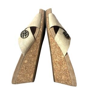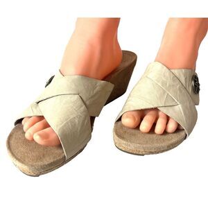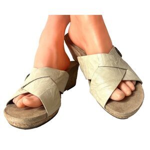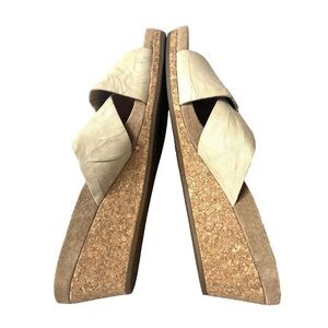 UGG Women's 9 Beige Leather Cross Slide Cork Wedge Summer Casual Sandals Slip On