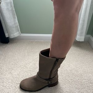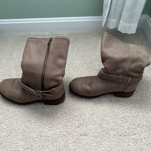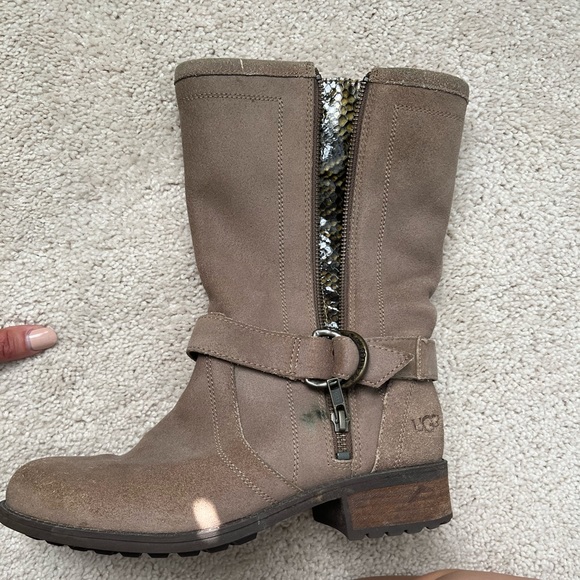 UGG boot with snake-skin detail on inside zipper. Truthfully I’ve only worn these a handful of times because my feet are too wide for them. Some markings from the buckle on one boot and a skiff on the other as shown in pictures.