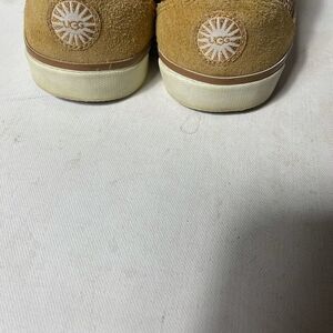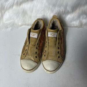 UGG gold sequins & tan leather suede sneakers with sheep skin fur lining SZ8 pre owned in good used condition signs of wear on the outer soles see all pictures any questions please message.
