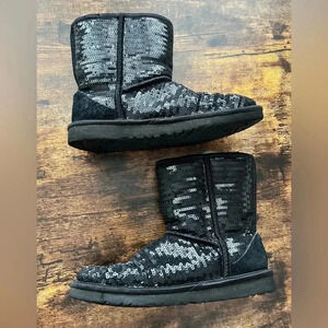 Womens classic Sparkles short Ugg boot. Shearling sheepskin lined. Very soft & comfy. Beautiful Sony black sequin exterior. Rubber sole. Traditional UGG tag at back of boot. Sequins are intact. Good, used condition.