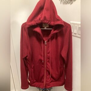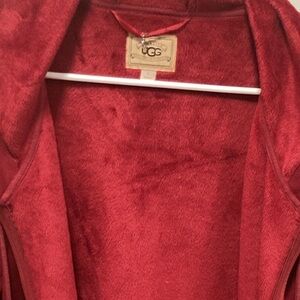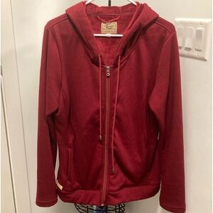 UGG zip up jacket with fuzzy inside and drawstring hood. Drawstring at the bottom hem, two slide in pockets and logo on lower left side.