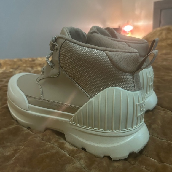 Stylish UGG high-top sneakers in tan and cream. Perfect for casual wear.
