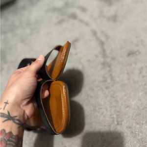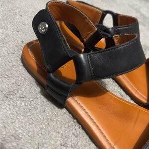 They feel like leather and have a Velcro strap in the side of the heels . Very very comfortable. Black and tan . Size 7.5