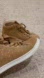 These UGG sneakers in size 6.5 feature a light tan suede upper with sparkling rhinestone embellishments for a stylish, eye-catching look. Designed in a mid-top silhouette, they come with matching tan laces and a comfortable white rubber sole. The UGG logo is subtly embossed on the side of the sole and on back .