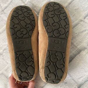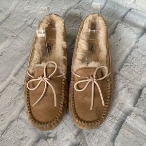 UGG women 9 slip on fur lined suede moccasins tan w/pink leather ties