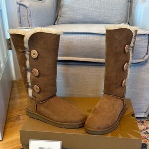 UGG women’s Bailey Button Tall chestnut, size 9. Worn once, always kept in box so not dust or debris. No marks.