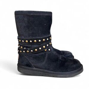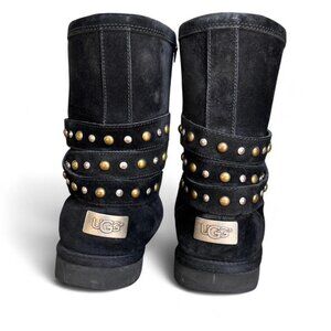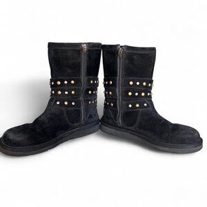 UGG women’s Clovis black suede leather studded boots. Left sole needs to be reinforced and all imperfections shown in photos. Height from bottom of sole to top of boot is 9 in.