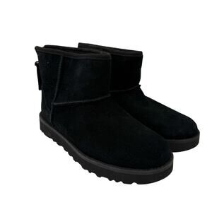 Step into cozy elegance with these UGG Classic Mini Boots in size 6. Crafted from premium suede and lined with plush sheepskin, these boots feature a charming bow tie detail at the back, adding a touch of femininity to the classic design. Perfect for colder days, they offer both warmth and style.