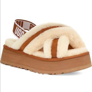 Beautiful fluffy slide that rest atop a chunky platform sole. Heel height 1 3/4” and platform height 1 1/2”. Chestnut color. Brand new never used.