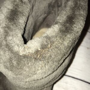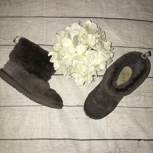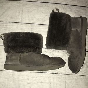 Preloved condition. UGG Kids' Fluff Mini Quilted Boots Charcoal Gray. Sheepskin collar. Woven UGG pull tab. 4.5” shaft height.